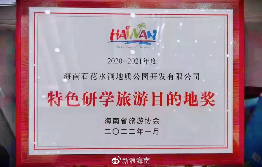 1月7日,海南省旅游协会六届二次会员大会暨2020-2021年度优秀旅游企业和先进个人表彰大会在海口市新埠岛诺富特酒店召开。会上公布2020-2021年度旅游业相关奖项,海南石花水洞地质公园开发有限公司(海南石花水洞地质公园)荣获“特色研学旅游目的地”荣誉称号。